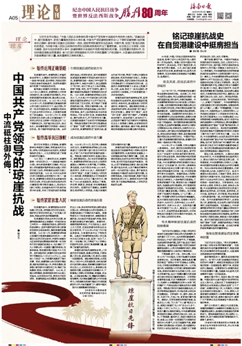 80年前,中国人民经过艰苦卓绝的浴血奋战,取得了近代以来反抗外敌入侵的第一次完全胜利。琼崖人民在中国共产党的领导下,孤岛浴血,书写了彪炳史册、光耀千秋的伟大篇章。今天,我们追忆琼崖抗战的历史丰碑,就要传承与弘扬伟大抗战精神,在加快海南自贸港建设中挺膺担当,奋勇前行。