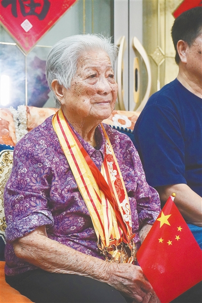 9月3日上午,纪念中国人民抗日战争暨世界反法西斯战争胜利80周年大会在北京隆重举行。在海口府城的家中,今年98岁的抗战老战士冯瑞梅早早洗漱好,将党员徽章和勋章依次佩戴整齐,与家人一起,坐在电视机前,等待阅兵式开始。