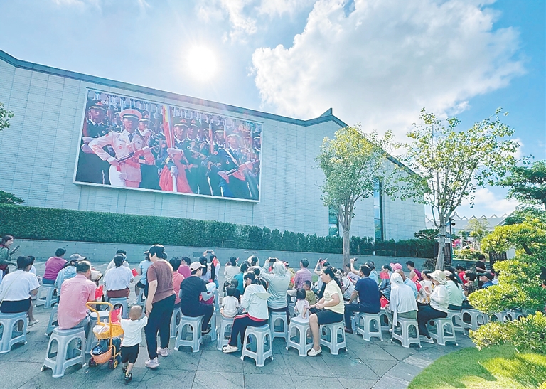 从首都北京到天涯海角,同一时刻,不同场地,涌动着相同情感。屏幕前,海南抗战老兵目光如炬,深情凝望,庄严敬礼;一个个革命老区村庄里,大家聚焦同一幅画面,倾听同一个声音,眼眶渐渐湿润;繁华商圈、公园的巨幕下,人潮汇聚,群情激昂;校园内,莘莘学子热血沸腾,倍感振奋,深受鼓舞;海南自贸港重点园区里,自贸港一线建设者心潮澎湃,不时爆发出热烈掌声……