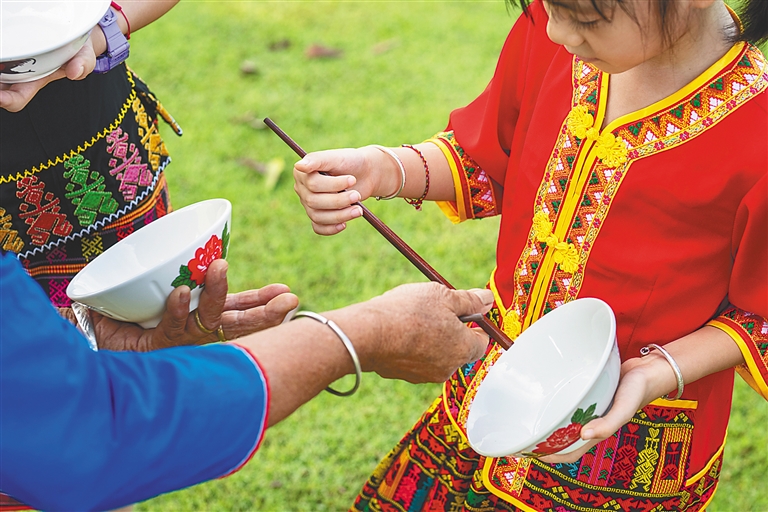 敲碗作舞、喃喃伴歌,祈福现场,黎族“娘母”沉浸在庄严而神秘的节奏之中,清脆的敲碗声仿佛穿越时空,奏响天、地、人沟通的独特旋律。