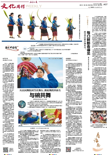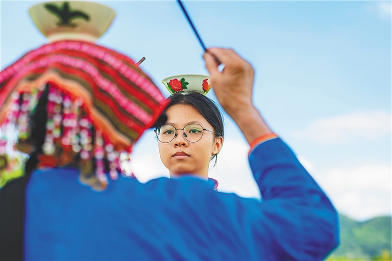 回忆起第一次登台表演时的情景,黄海妹仍会雀跃。“那年嬉水节人山人海,我紧张得手心直冒汗。婆婆教过我,左右摆肩要留头,扭身时头不能跟着转,一扭碗就掉了。”黄海妹说,跳这支舞,要全神贯注。舞动时平衡碗具的惊人技艺,背后也是日复一日的训练和努力。