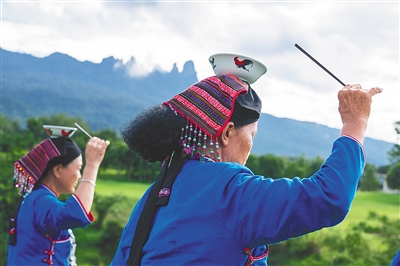 自家院落里,加茂村村民黄海妹在农忙归家后,和姐妹们自由舒展双臂,跳起了传承千年的跳娘舞,身姿如同一只在云端翩翩起舞的灵鸟。