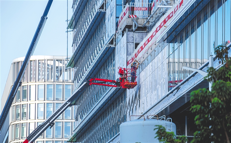 9月5日,在海口江东新区中国石油海南区域总部基地项目现场,工人开展楼体外立面装修。据悉,自2020年以来,江东新区聚焦临空经济、新金融、消费精品、数字智慧及出口型、外向型产业等,累计招引重点企业483家,其中世界500强企业48家。