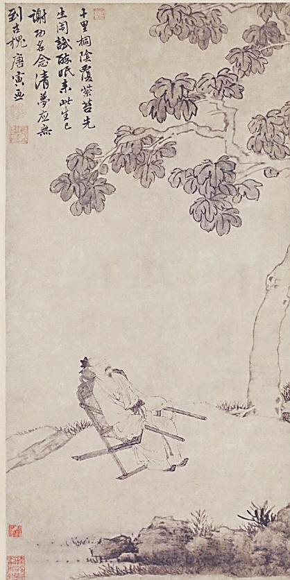 又如《桐阴清梦图》,梧桐下,坡石间,一人仰躺椅上闭目养神,悠然自得。全画构图疏朗,配上“此生已谢功名念,清梦应无到古槐”的题画诗,是画家看破红尘、幽居林下的诗化写照。