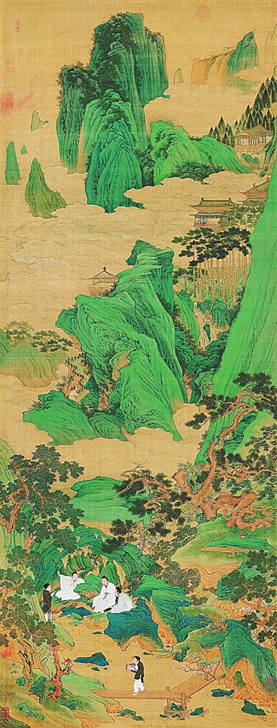 仇英年轻时深受文徵明、唐寅等人的器重,吸取了吴门画派文人画之长,创作了许多以诗赋名篇为灵感的画作,如《赤壁图》《剑阁图》等。其中,以陶渊明《桃花源记》为母题而创作的青绿山水画《桃源仙境图》更是佼佼典范。图中以艳丽青绿点染的重重山石为云雾所缭绕,虬松盘绕的山体与云雾造成的留白形成了鲜明的疏密对比。三位白衣文士临流而坐,一名童子侍立在旁,另一童子行于桥上,展现出远离世俗的仙境景象,体现了文人隐逸理想。