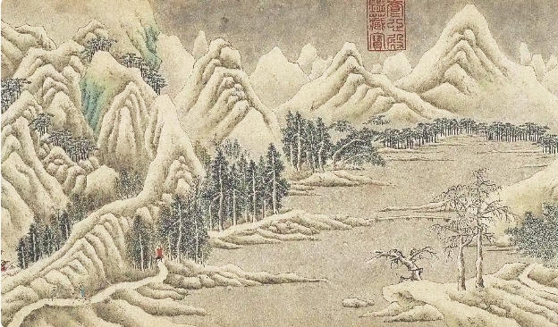 《关山积雪图》是文徵明前后耗时5年完成的长卷力作。嘉靖七年(1528),天降大雪,文徵明与忘年交王宠在苏州城西南的上方山游玩,“值雪飞几尺,千峰失翠,万木僵仆,履吉出佳纸索图,乘兴濡毫,演作关山积雪……”画中只见绵延群山被皑皑白雪覆盖,水岸凝滞,寒林苍劲,数名红衣骑驴者行旅山间,为画面增添了一抹生气。唐寅极赞此图:“千山寒色,宛然在目,殊非高手不能。”