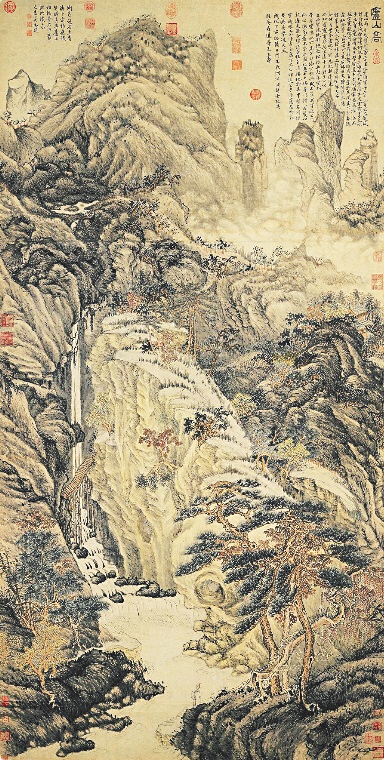 《庐山高图》是沈周40岁时为老师陈宽祝寿而作的巨幅山水,此图仿王蒙笔意,作于从“细沈”到“粗沈”的转折时期。沈周一生从未去过庐山,但他凭借超凡的想象力和创造力画出了仰之弥高、望之氤氲的名山气象——远景群峰列岫,中景悬瀑吊桥,近景坡脚溪流,气韵贯通,脉络分明。