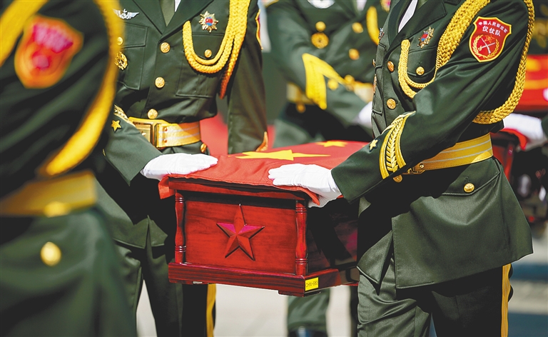 图为礼兵护送志愿军烈士棺椁走向沈阳抗美援朝烈士陵园安葬地宫。新华社发