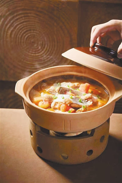 “酸豆酱的天然酸味柔和,能把鱼的鲜完全激发出来,还不抢味。”周凤翎做酸豆鱼的手艺,学自家中长辈,做法简单却讲究:螺汤打底,放入剥壳冷藏的酸豆(即酸豆酱),大火煮开,下鱼块煮至浮起变色,再加西红柿、豆腐慢炖;若逢杨桃上市,切几片放入增酸提鲜。“汤色清亮微黄,鱼块嫩滑不散,豆腐吸满汤汁,酸香纯粹不刺鼻,回甘自然,这就是崖州家常菜酸豆鱼的特色。”
