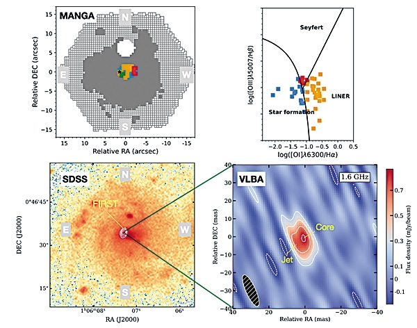本次我国团队换了思路,不盯X射线,转而观测“射电波”——这类信号更易捕捉黑洞吸积过程中产生的高速喷流。研究团队先通过“近邻星系光谱巡天(MaNGA)”数据,发现一个矮星系的射电信号不在中心,反而位于3000光年外;再用由10台射电望远镜组成的“甚长基线阵列(VLBA)”进行深度成像,确认该信号来自温度超10亿开尔文的高温源(仅黑洞能达到这一温度),且几十年来信号“时强时弱”(符合黑洞吸积气体的特征)。