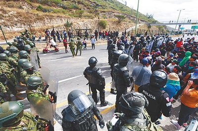 图为16日在厄瓜多尔首都基多,武装部队人员和警察在道路上维持秩序。新华社发