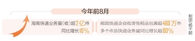 全省邮政快递业正在更好地服务线上线下经济发展、促进产品要素流动、助力降本提质增效,主动融入和服务海南自贸港建设。据统计,前8月,海南快递业务量(收)超2亿件、同比增长10%,自2023年、2024年连续2年突破2亿件基础上,今年较2024年提前约2个月突破2亿件。