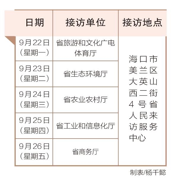 9月22日至26日,省旅游和文化广电体育厅、省生态环境厅、省农业农村厅、省工业和信息化厅、省商务厅相关负责人将在海口市美兰区大英山西二街4号省人民来访服务中心接访群众。