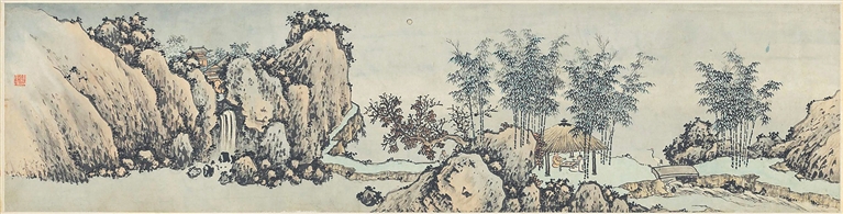 《有竹庄中秋赏月图》由画面与书法两部分组成,高头大卷,以诗、书、画“三绝”为后人称颂,是沈周书画作品中的皇皇巨制。其中,画面纵34厘米,横136厘米,明月高悬,山水清胜,竹树桥亭,景致幽静。中心为一座茅亭,四周绿竹参差,竹影摇风。亭中二人相对而坐,品茗赏月,把盏吟诗。一只仙鹤立于亭边桥上,望向茅亭;小径蜿蜒,不远处山峦之上隐见亭台楼阁,两山对峙间飞瀑倾泻而下,显示出传统文人处江湖之远的山水意趣。整个画面墨色浑厚,冷寂清幽,笔墨雄健老辣,格调疏简苍劲,诗意浓郁,给人以无尽遐想。