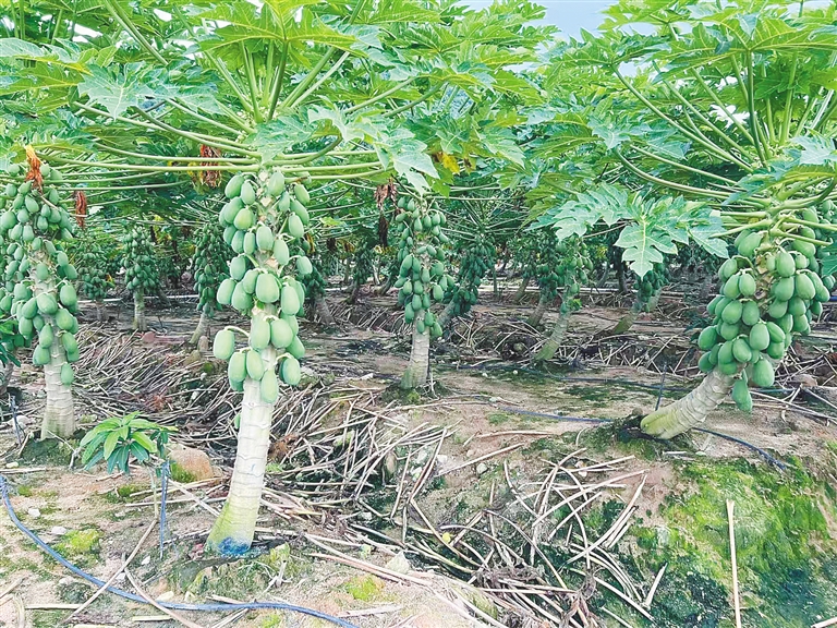 近日,海南日报全媒体记者走进位于三亚市育才生态区的一个木瓜种植基地,只见一棵棵木瓜树硕果累累。小雨过后,空气中弥漫着果香味,眼前一派丰收景象。