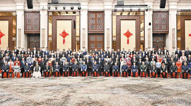 习近平等来到接见现场时,全场响起长时间热烈掌声。习近平向大家挥手致意,不时同代表亲切交流,并同大家合影留念。