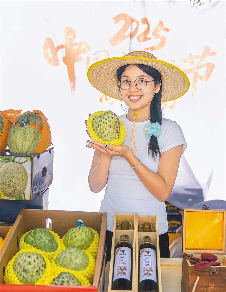 颜色各异的圣女果,可溯源的琼中绿橙,入口即化的牛油果,还有可以生吃的枫木有机苦瓜……在农民丰收节主会场,各个市县摊位前的绿色优质农产品拼出一幅热带特色高效农业的别致“丰景”,吸引了很多参会观众驻足。