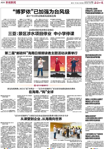 本报三亚9月27日电(海南日报全媒体记者郭畅 李艳玫 李梦楠)为应对今年第20号台风“博罗依”,9月27日,三亚市启动防汛防风Ⅲ级应急响应。截至目前,涉客船舶方面,辖区共有涉客航线11条,已全部停运;景区涉及水上项目均已暂停营业;中小学校、幼儿园、校外培训机构28日停课。