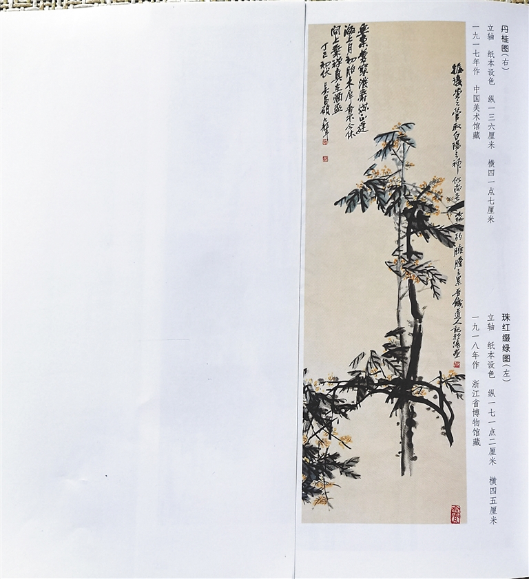 清末民初画家吴昌硕的《丹桂图》立轴,纸本设色,纵136厘米,横41.7厘米,现收藏于中国美术馆。从画面看,桂树主干直立,一横枝从右向左伸出,枝上桂花密缀,那藤黄色桂花与花青色枝叶相映衬,别具意境。画面以枯笔写枝,淡墨点叶,叶片用花青调和,花蕊以藤黄着色,清雅自然。画面左上方题诗曰:“画稿苍寒泼麝煤,正逢海上月初胎。木樨香否今休问,上乘禅真在酒杯。”为画面平添了几分诗意,让人遐思不已。