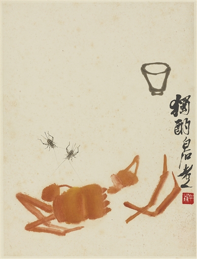 齐白石笔下的螃蟹,有张牙舞爪的活蟹,也有浑身通红、与酒盏相伴的熟蟹。古人有诗云:“右手持酒杯,左手持蟹螯。拍浮酒船中,便足一生矣。”这样诱人的情形,被白石老人艺术化地展现在画作中,变成饶有趣味的水墨佳作。