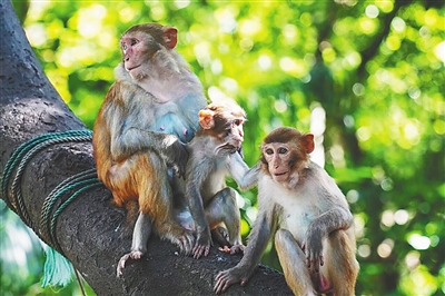 ③陵水黎族自治县的南湾猴岛景区,三只猴子在树上休息。