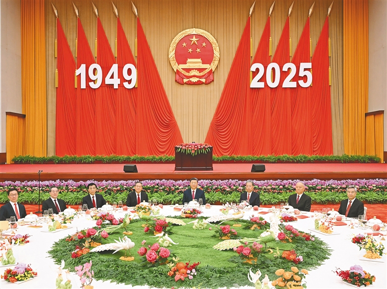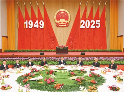 人民大会堂宴会厅华灯璀璨,洋溢着喜庆热烈的节日氛围。主席台上方高悬着庄严的国徽,“1949-2025”大字年号在鲜艳红旗映衬下格外醒目。
