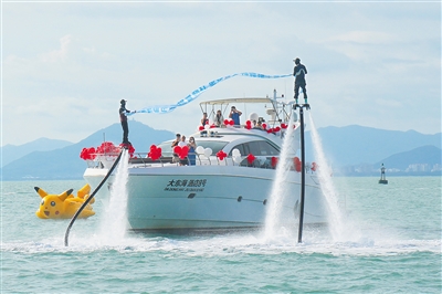 ③国庆中秋假期,游客在三亚湾海域乘坐游艇,体验水上娱乐项目。