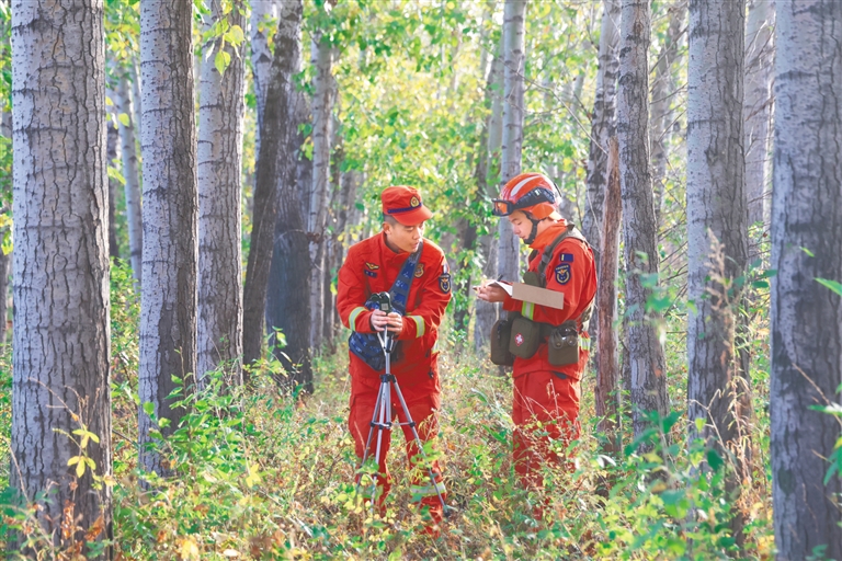 10月2日,黑龙江省森林消防总队哈尔滨市支队特勤大队的消防员在哈尔滨市松北区测量林区风力、湿度和可燃物载量。