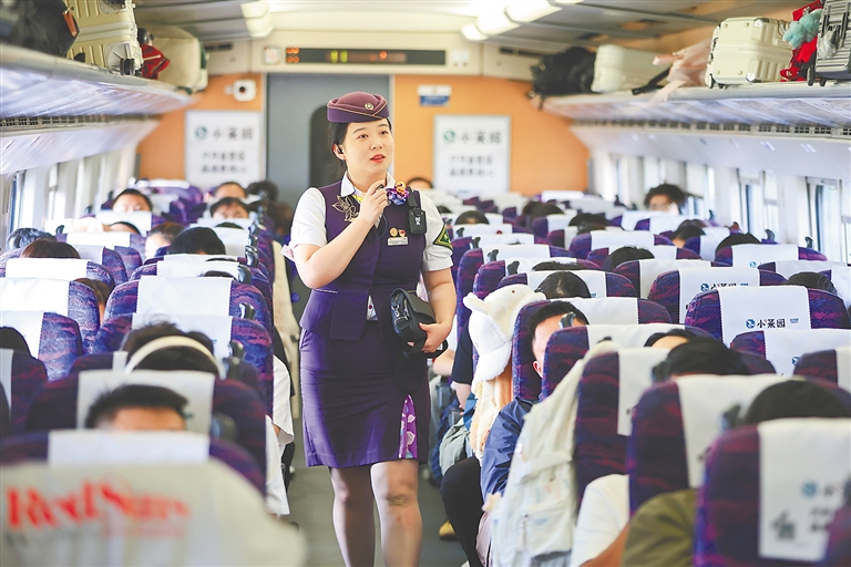 10月1日,乘务人员在D5409次列车车厢内巡查。