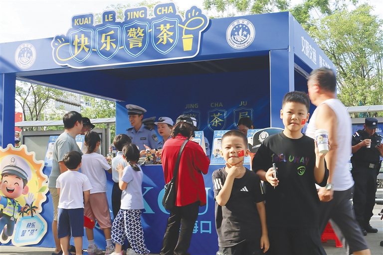 “您好,想尝尝我们的‘警茶’吗?扫码答几道题就行!”身着制服的海口交警化身“普法主理人”,笑着招待游客。