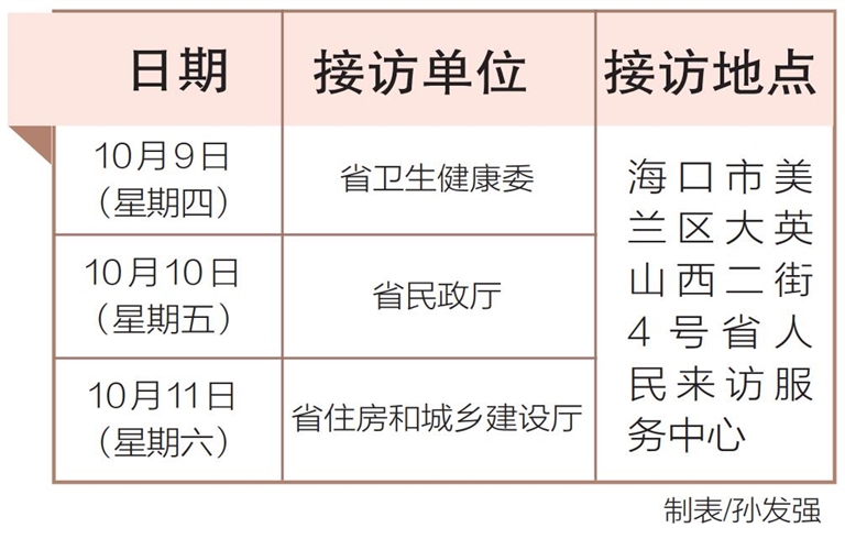 10月9日至11日,省卫生健康委、省民政厅、省住房和城乡建设厅相关负责人将在海口市美兰区大英山西二街4号省人民来访服务中心接访群众。
