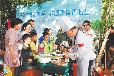 北宋绍圣四年,苏东坡谪居儋州,将中原文化与东坡肉烹制技艺带入海南,至今已传承近千年。儋州东坡肉在承袭古法基础上,发展出“慢火、少水、多酒”的独特工艺,2023年12月被列入第六批省级非物质文化遗产代表性项目名录。从葱姜处理、猪肉焯水煎制,到加料烧制、隔水慢蒸……活动现场,获“中国烹饪大师”“儋州十大金牌厨师”称号的陈生强展示着这门非遗技艺,块形方正、色泽红亮、香糯不腻的成品让在场市民游客赞不绝口。