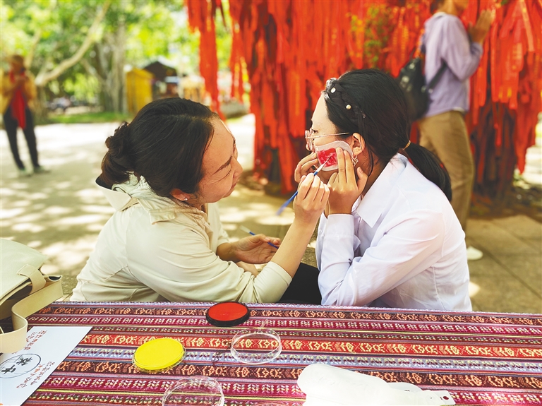 “这是我从公园里捡到的红毛丹叶子,把它拓印成植物画带回家保存。”来自海口的小游客李清在工作人员的指引下,用锤子轻轻敲击,将叶子独特的形状与纹理拓印在帆布袋,打造独一无二的“自然勋章”。