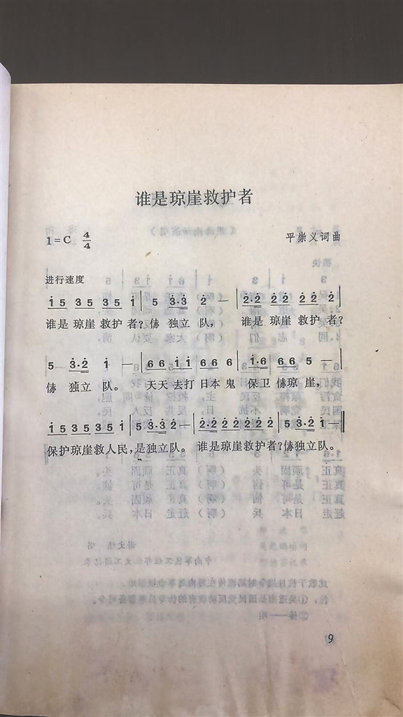 《谁是琼崖救护者》的原词署名作者为“平崇义”,原词为:“谁是琼崖救护者,亻赤(方言,相当于‘咱’)独立队,天天去打日本鬼,保卫亻赤琼崖,保护琼崖救人民,是独立队。”这段歌词通俗生动地描述了中共琼崖特委才是海南抗战的中流砥柱。据《海南省志·文化志》记载,“平崇义”为琼崖特委文艺宣传干部,他也是抗战歌曲《独立队之歌》《全琼总动员》的作者。《独立队之歌》较短,采用海南民歌曲调,歌词为:“独立队,打日本鬼,保护百姓,枪炮缴获,几百枝(支),四海扬名。”这首歌展现了琼崖抗日独立队保护百姓、抗击日本侵略者的功绩。《全琼总动员》歌词稍长,其中写道:“有力快出力,有钱快出钱,快扩大我们抗日独立队,一切为着打日本呀,嘿,争取最后胜利!”这首歌采用的是陕北民歌曲调,抗战时期广泛流传于琼崖抗日根据地,在这首歌曲的鼓舞下,根据地许多地方出现了母送子参军、妻送夫参军的感人场景,反映出海南人民与我党领导的琼崖抗日武装之间的鱼水深情。