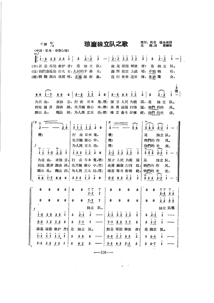正是在这种艰苦的环境中,中共琼崖特委在冯白驹的领导下,组织创作了许多著名的抗战歌曲,其中《谁是琼崖救护者》《全琼总动员》《独立队之歌》(非《琼崖独立队之歌》)流行一时,极大鼓舞了琼崖抗战军民的战斗意志。通过对比曲谱,可以确定《琼崖独立队之歌》的原作为《谁是琼崖救护者》,两者曲谱基本相似,歌词部分相同。