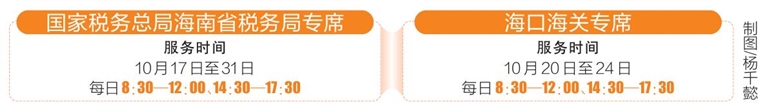 为积极回应社会关切,海南12345热线推出专席驻场接话服务,具体安排如下:国家税务总局海南省税务局专席服务时间为10月17日至10月31日,每日8:30—12:00、14:30—17:30;海口海关专席服务时间为10月20日至10月24日,每日8:30—12:00、14:30—17:30。