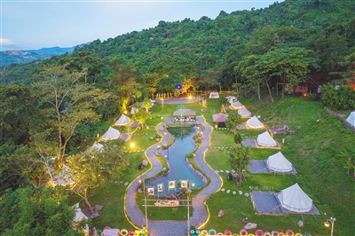 ② 琼中百花岭热带雨林文化旅游区的露营基地灯光闪烁。