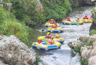 ① 游客在五指山红峡谷文化旅游区体验峡谷漂流项目。