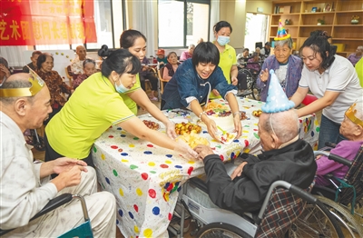 10月29日重阳节,海南省老年人体育协会走进海口琼山区凤翔街道综合养老服务中心开展慰问演出活动,与老人们共庆传统节日。这是活动中,工作人员为本月过生日的4位老人递上生日蛋糕,送上真挚祝福。海南日报全媒体记者 李天平 摄
