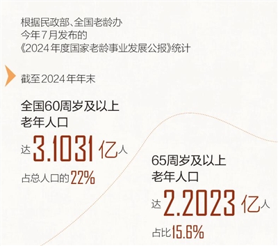 养老,已然成为事关千家万户福祉的重大课题。根据民政部、全国老龄办今年7月发布的《2024年度国家老龄事业发展公报》统计,截至2024年年末,全国60周岁及以上老年人口达3.1031亿人,占总人口的22%;65周岁及以上老年人口达2.2023亿人,占比15.6%。