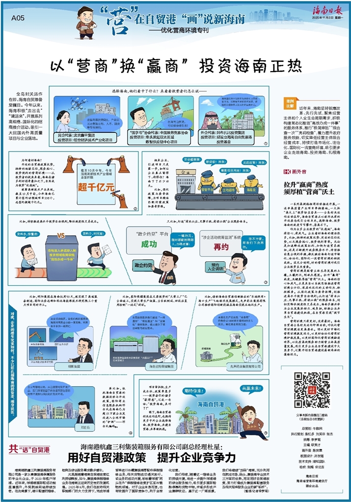 作为众多企业投资的“优选地”,海南有信心、有底气。企业看好海南的理由很多,比如,独特的政策优势、突出的区位优势,以及服务贴心、投资便利等等。无论是加速释放政策红利、加快打造贸易枢纽,还是不断提升政务服务水平、持续推出惠企便利举措,都反映出海南打造市场化、法治化、国际化一流营商环境的积极成效。这充分说明,好的营商环境对吸引企业投资至关重要。