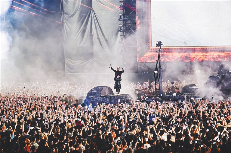 本次演唱会采用全站立沉浸式观演设计,白鹭体育场化身激情澎湃的音乐海洋。随着特拉维斯·斯科特《FE!N》等一首首代表曲目响起,舞台上的装置瞬间点亮,在夜空中交织出绚烂的光影矩阵。当副歌部分爆发时,焰火发射点齐射,金色火花如瀑布般倾泻而下,将现场气氛推向高潮。