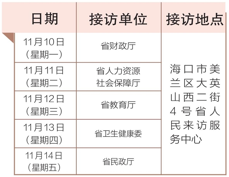 11月10日至14日,省财政厅、省人力资源社会保障厅、省教育厅、省卫生健康委、省民政厅相关负责人将在海口市美兰区大英山西二街4号省人民来访服务中心接访群众。