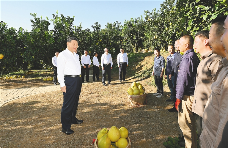 金柚是梅州的特色农产品。正值收获季节,柚子园硕果累累。习近平来到雁洋镇南福金柚种植基地,在展示厅听取广东加大对革命老区支持力度、推进乡村全面振兴等情况汇报,察看柚子及其加工产品、文创产品。他走进果林,同果农和农技人员亲切交流。得知今年金柚喜获丰收、销路畅通,习近平十分高兴。他指出,发展乡村特色产业是推进乡村全面振兴的基础,要加强科技应用,推动农文旅融合,不断延伸产业链、增加附加值,带动更多农民群众增收致富。