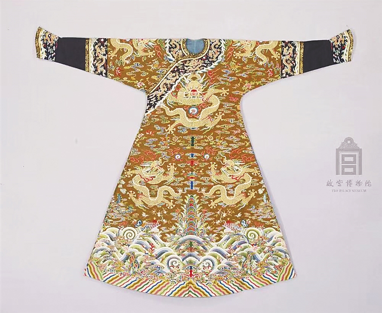 “新中装”的立领对襟和开襟设计明显是古装的版型,宋锦为真丝织成,作为“丝绸之路”的起点,这也是中国特有的地域名片。其上的海水江崖纹,最早可追溯至先秦时期的水波纹,到明清时期,海水江崖纹的使用达到鼎盛时期,被广泛应用于皇帝龙袍、官员朝服、地毯、瓷器和玉器等各类宫廷器物之上。