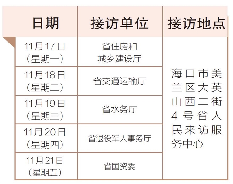 11月17日至21日,省住房和城乡建设厅、省交通运输厅、省水务厅、省退役军人事务厅、省国资委相关负责人将在海口市美兰区大英山西二街4号省人民来访服务中心接访群众。