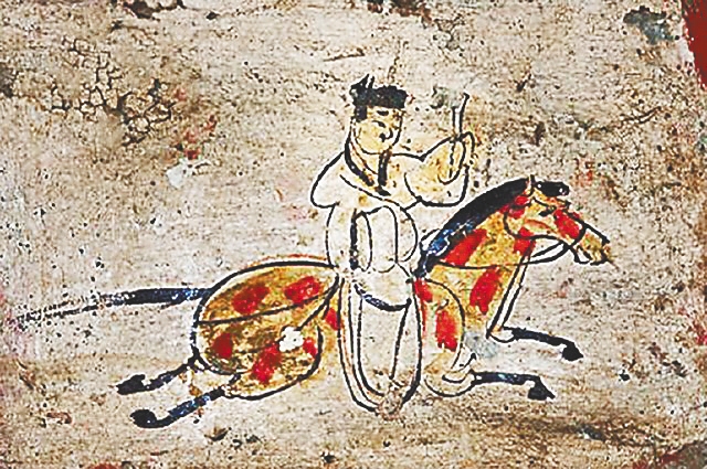 《驿使图》纵17厘米,横35厘米,厚5厘米,米色设底,黑色轮廓线,马身涂黄色,点缀红色斑块,绘于3世纪前后,艺术地再现了距今1600多年前西北边疆的驿使,一骑绝尘的邮驿情形。画面上,形似当下“快递小哥”的驿使,头戴黑帻进贤冠,身穿右襟宽袖衣,骑跨红鬃烈马,足蹬长靴,左手举持棨传(过关时的信物凭证)文书,右手紧控缰绳疾驰,驿骑四蹄腾空,凸显出驿递任务的重要和紧迫。驿使神情肃穆,面部没有嘴巴,一种观点指出,这是旨在强调昔日邮驿事关军务、政令,保密性强,职责要求必须守口如瓶。驿马的刻画尤为精彩:马首高举,鼻阔耳削,目大有神,颈粗臀肥,胸廓健壮,细腿小蹄,筋腱毕露,长尾平甩,尽显宝马良驹快如闪电、急如星火、高速驰骋的英发雄姿。