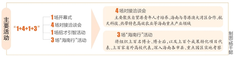 本届人才交流大会总体设计“1+4+1+3”架构,即举办1场开幕式、4场对接洽谈会、1场招才引智活动、3场“海南行”活动。其中,4场对接洽谈会,主要聚焦自贸港青年人才培养、海南与粤港澳大湾区合作、航天科技、热带特色高效农业等海南重点产业领域,开展学术研讨、签约合作等活动。3场“海南行”活动,将组织上百名博士、博士后,以及上百个成果转化项目代表、上百家省外高校代表,深入海南各市县、重点园区实地考察,推动项目和人才精准落地。