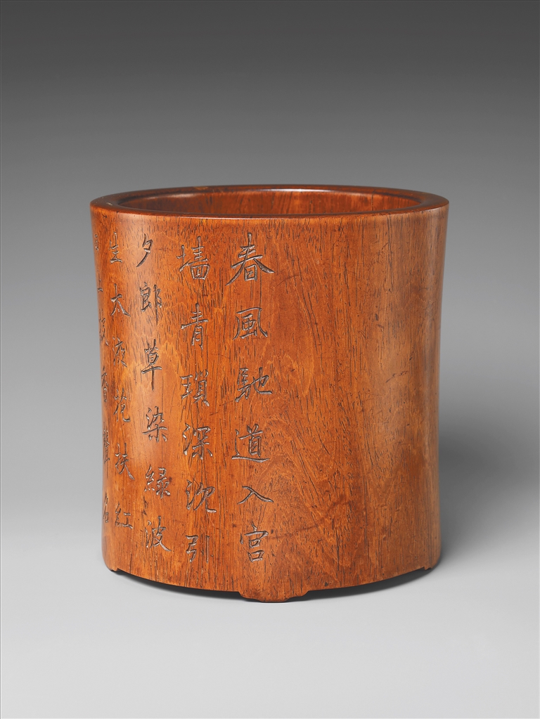 它是美国大都会博物馆藏的汪士鋐款黄花梨笔筒。在博物馆官网上,这一笔筒又被称为:带有诗歌的刷子罐。
