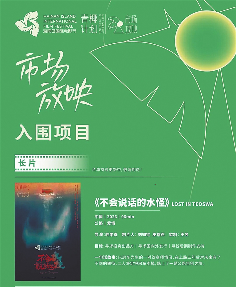 本报讯 (海南日报全媒体记者李艳玫)近日,第七届海南岛国际电影节“青椰计划”正式公布市场放映单元入围项目名单。本届“青椰计划”设立“市场放映”板块,旨在搭建连接海内外电影产业的枢纽平台,积极推动国内外优质影片与创作项目“走出去”与“引进来”,促进电影资源的国际流动与合作。